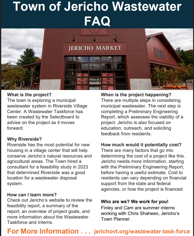 Bringing municipal wastewater to Riverside, one of Jericho’s designated Village Centers, is key to achieving many goals in Jericho’s Journey Forward – the town plan adopted in January 2024 - including creating dense walkable communities, more affordable housing, and diverse housing options. Recognizing that wastewater is a key ingredient for achieving these community goals, the Jericho Selectboard created the Jericho Wastewater Task Force in April of 2025. Building on the recommendations in a recently completed feasibility study, the Task Force is exploring the creation of a wastewater system in Riverside Village. Read the full document of Task Force Charge and Operating Guidelines here.